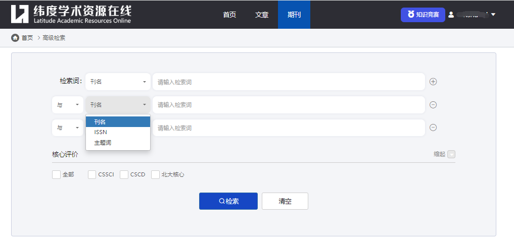 可以通过刊名、ISSN、主题词、学科名进行与、或组合检索,筛选核心评价体系,提高检索效率。