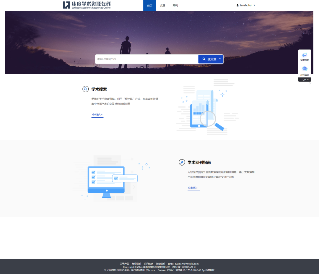 Spischolar学术资源在线(又名:纬度学术资源在线),主要由学术搜索和学术期刊指南构成,是国内收录资源全、检索效率高、获取方式多样、且实用的学术资源检索数据库。数据库集成整合了国内外主流全文数据库中的优质文献资源,以大数据分析技术为支撑,对文献资源进行学术期刊关联整合,构建“学科到期刊,期刊到文章”的资源获取服务生态,为科研学习过程中的课题调研、文献下载、期刊查询与分析、投稿选刊等方面提供高附加值解决方案,助力读者高效开展科研学习工作。