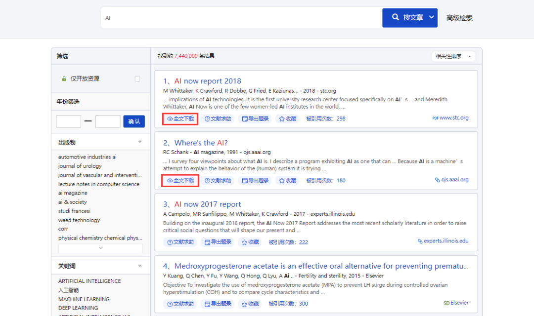 有“全文下载”按钮的文章,可以直接点击下载PDF全文,或跳转到可下载网站直接下载。