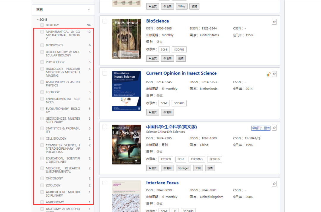 提供收录数据库、学科、期刊语种等筛选功能,可以利用学科筛选功能,查看交叉学科的高水平期刊,有效拓宽研究领域和投稿范围。