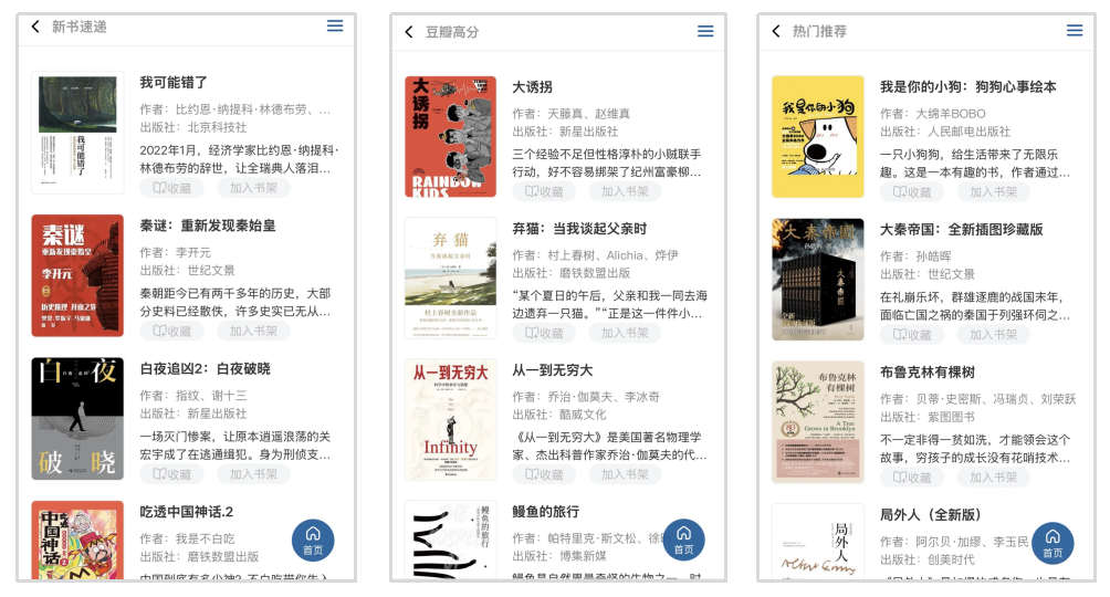 除经典典籍图书以外,平台紧跟社会热点与大众阅读趋势,收录畅销文学作品、影视原著、新书速递、豆瓣好书等。古今中外,想看的书都可一网打尽。