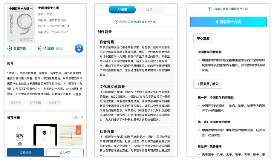 结合AI大数据分析,平台内的经典图书由AI工具自动生成AI综述与思维导图的图书内容大纲,快速了解书籍的中心主题与创作背景。