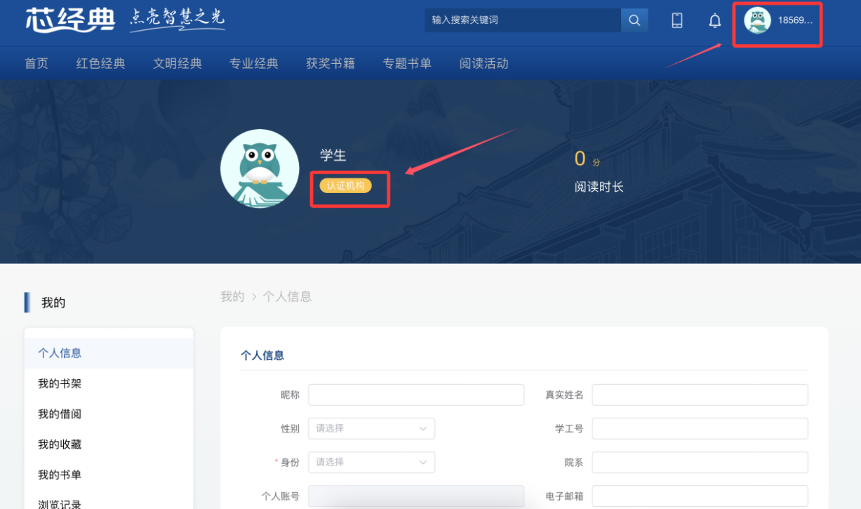 第三步:请先连接校园网WiFi,点击页面右上角头像-点击【认证机构】-选择【西安交通工程学院】进行认证即可。