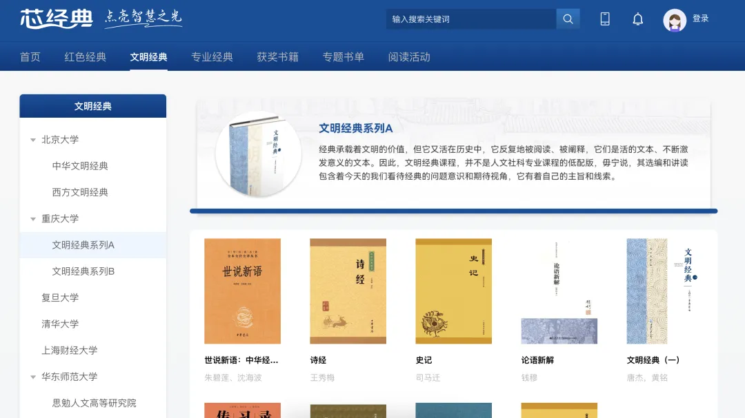 芯经典文明典籍学习平台以经典图书为基础,携手多所顶尖高校,汇聚通识领域及学科专业领域的权威专家学者,共同甄选并推荐书单。同时,平台引入名师导读视频、AI辅助阅读,通过在线教学、活动运营推广,构建起“资源+服务+活动三位一体的经典阅读推广模式。