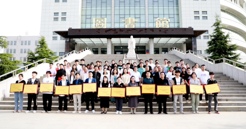 会议结束后,校领导与获奖单位和个人在图书馆门前台阶合影留念。