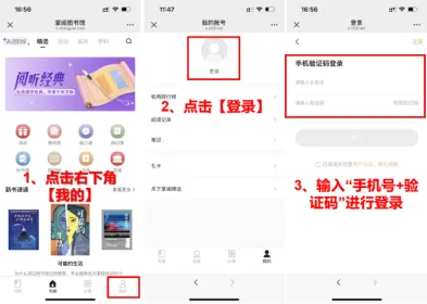 点击右下角“我的”,再点击上方“点击登录”,输入手机号和验证码即可注册或登录