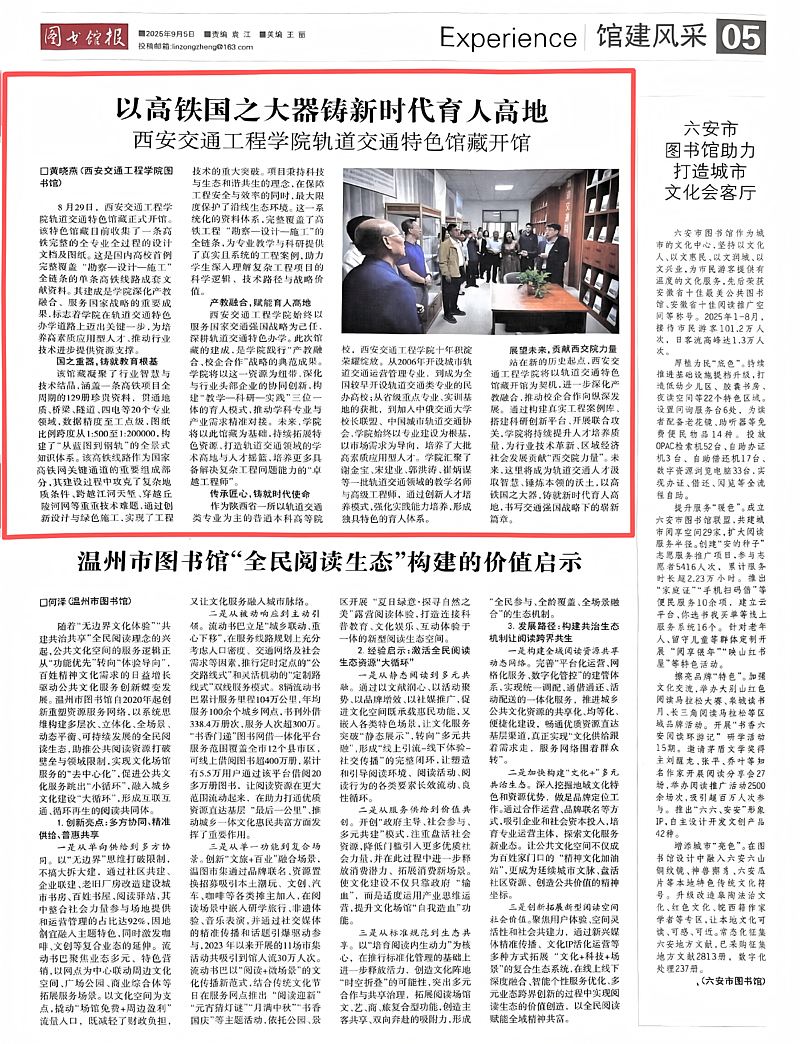 2025年8月29日,我校图书馆一楼大厅冠盖云集,“轨道交通特色馆藏开馆仪式”在此隆重举行。本次活动由西安交通工程学院、中国铁道出版社有限公司、中国铁道博物馆、中国铁道文联摄影分会联合主办,交通运输学院与图书馆承办,中铁第五勘察设计院集团有限公司及中国铁路图片网提供支持。铁路行业企业代表、专家学者、学校领导及师生代表齐聚一堂,共同见证这一具有特殊意义的时刻,为学校轨道交通特色教育再添浓墨重彩的一笔。《图书馆报》对我校图书馆这一重要时刻进行报道,相关内容已见报。