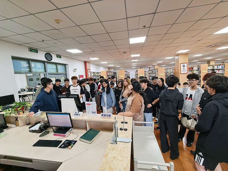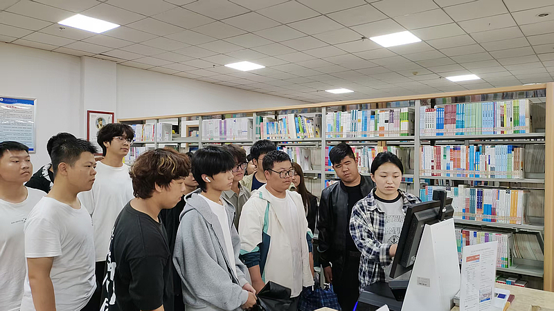 在线下环节,图书馆组织各二级学院新生分批次开展集中宣讲与实地参观。馆员现场讲解中图法分类体系、馆藏检索系统操作流程,并带领学生深入阅览区、自习区、电子阅览室、研讨空间等功能区域,直观体验学习环境。在阅览室向新生们演示自助借还书机、座位预约系统、以及移动端“图书馆微信服务号”“图书馆微信公众号”小程序的操作方法。此外,馆内智能咨询机器人也已投入使用,为学生提供全天候咨询服务