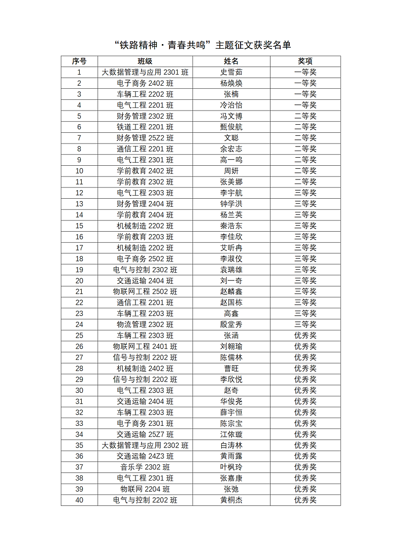 "铁路精神·青春共鸣"征文活动已圆满落下帷幕,活动最终评选出一等奖4名、二等奖7名、三等奖13名及优秀奖16名,现将获奖名单公布如下:
