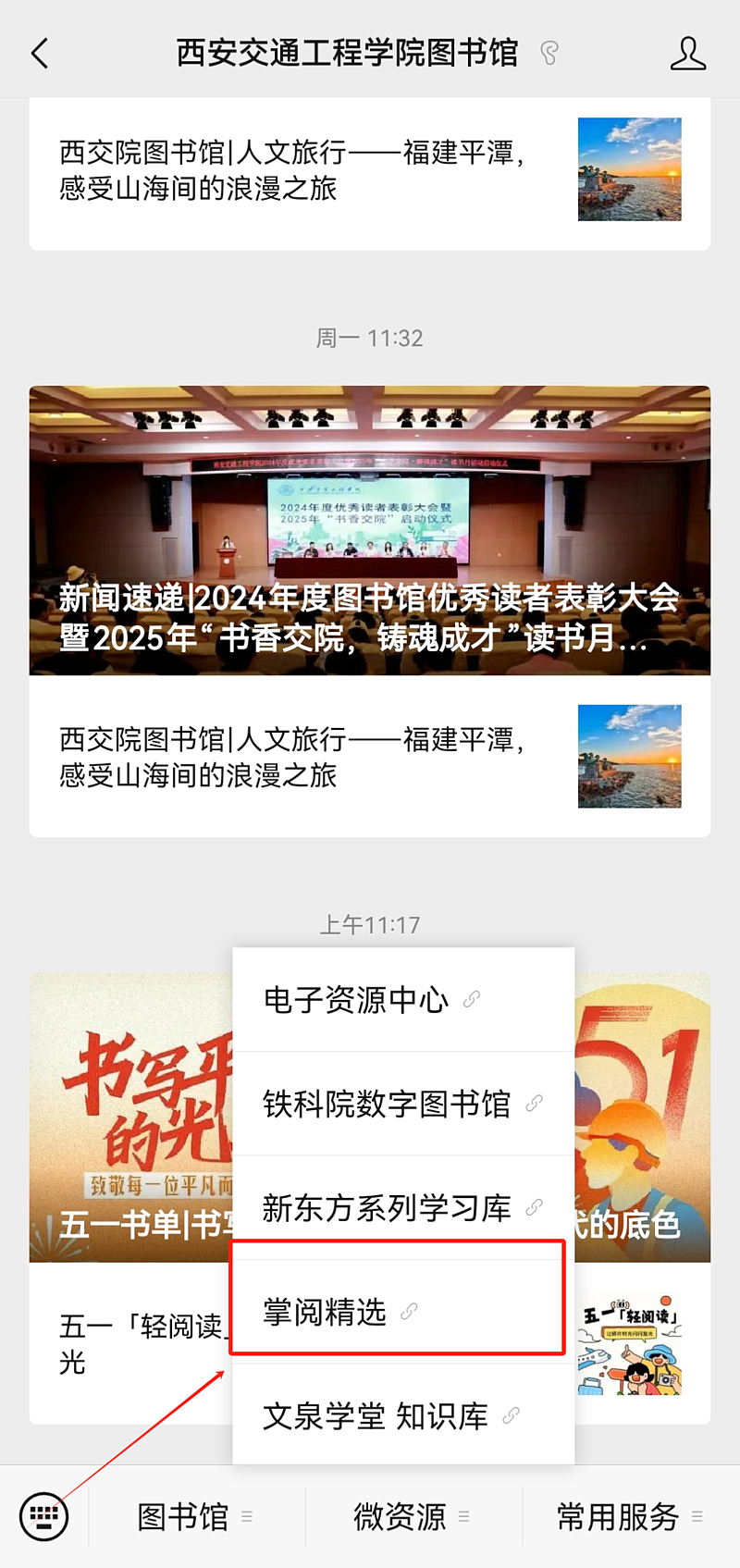 关注“西安交通工程学院图书馆”微信图公众号,在对话框点击“掌阅精选”子栏目;