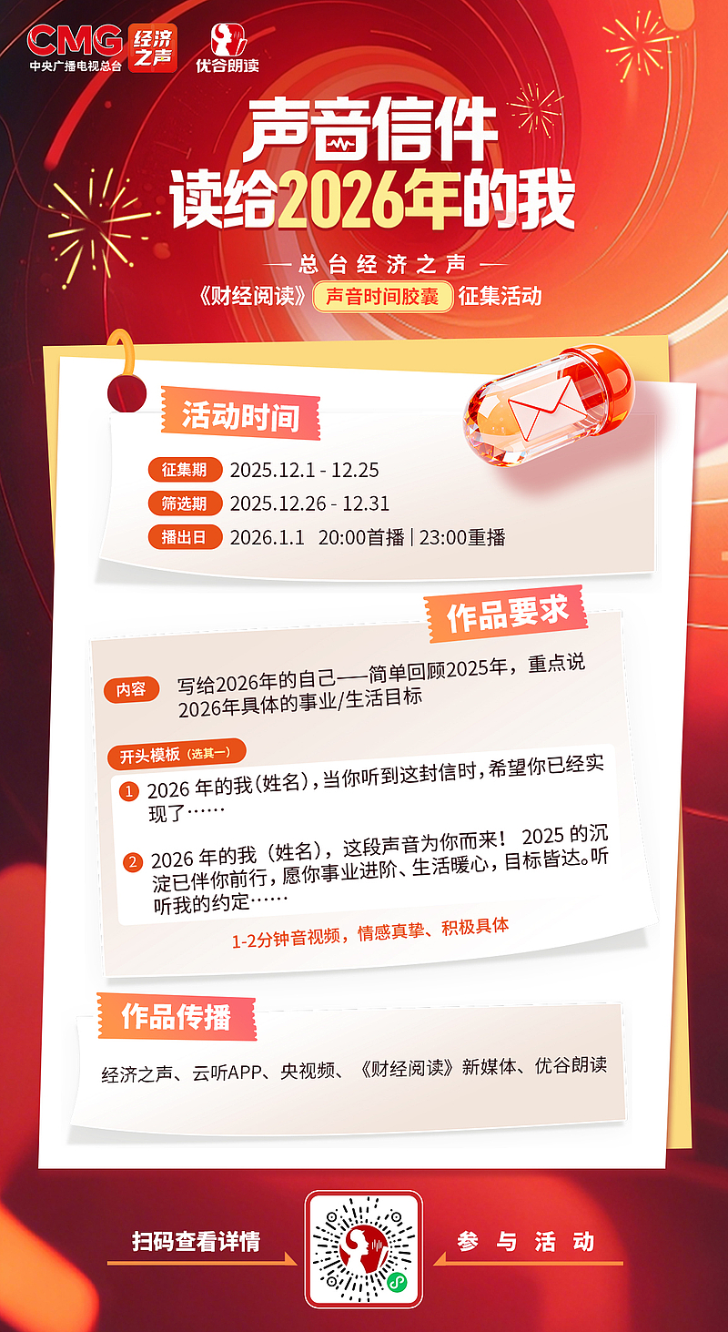 总台经济之声《财经阅读》节目组将从所有声音来信中,精选那些充满温度与力量的“声音信件”,制作成“声音时间胶囊”,在2026年1月1日的节目中播出。云听APP、央视频、《财经阅读》新媒体、优谷朗读平台同步展播作品。